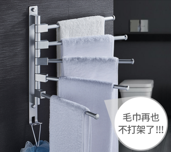 用旋转毛巾架代替普通的挂杆式毛巾架,不仅可以收纳多条毛巾,而且在不用时折叠起来贴在墙面上,不占空间,需要时再展开就行。